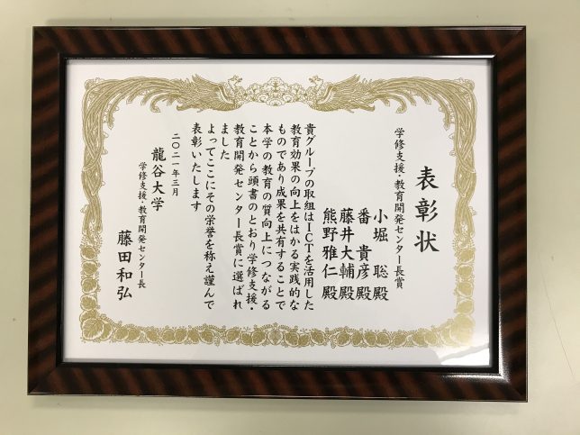 2020年度第1学期に開講された「電子情報実験Ⅰ」において、manaba、Google ドライブ、および Microsoft Teams を活用した講義が評価され、担当教員である小堀聡教授、番貴彦助教、藤井大輔実験講師、熊野雅仁実験講師に対し、龍谷ICT教育賞(学修支援・教育開発センター長賞)が授与されました。