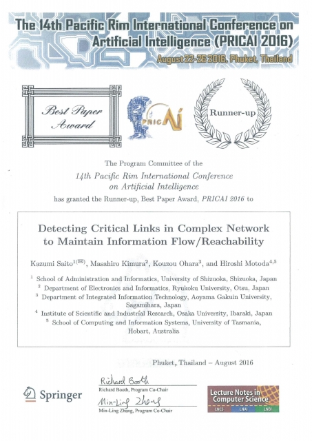 木村昌弘教授らの論文”Detecting Critical Links in Complex Network to Maintain Information Flow / Reachability”が、8月22日から26日にタイのプーケットで開催された国際会議 PRICAI 2016 (14th Pacific Rim International Conference on Artificial intelligence) において、”Runner-up, Best Paper Award”を受賞しました。